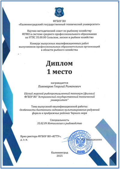 Работы были представлены по направлению подготовки 35.00.00 Сельское, лесное и рыбное хозяйство. Была направлена выпускная работа студента ихтиологического отделения Пивоваров Георгий на тему: «Особенности биотехники садкового культивирования радужной форели в прибрежных районах Черного моря». По итогам конкурса ВКР выпускник Ейского морского рыбопромышленного техникума ихтиологического отделения занял 1 место, тем самым подчеркнул важность выбранного направления.